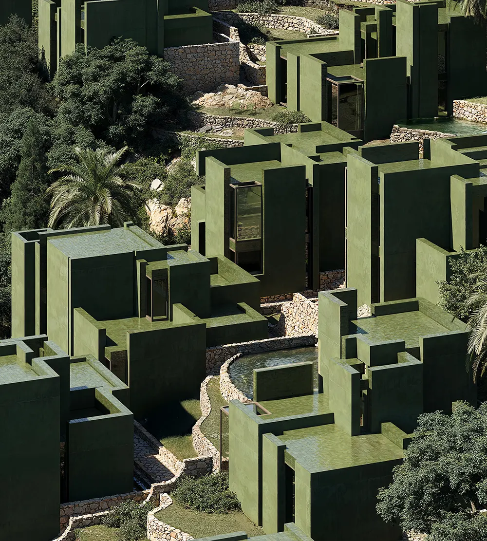 Circulation reinforces this reading. A network of paths and stairs constructed from locally sourced stone connects the development. These routes step with the land, establishing a clear movement system without introducing large infrastructural elements. The material palette draws from the immediate environment, with four tones selected through direct sampling. This decision anchors the project visually, allowing circulation to integrate with the terrain rather than stand apart from it.