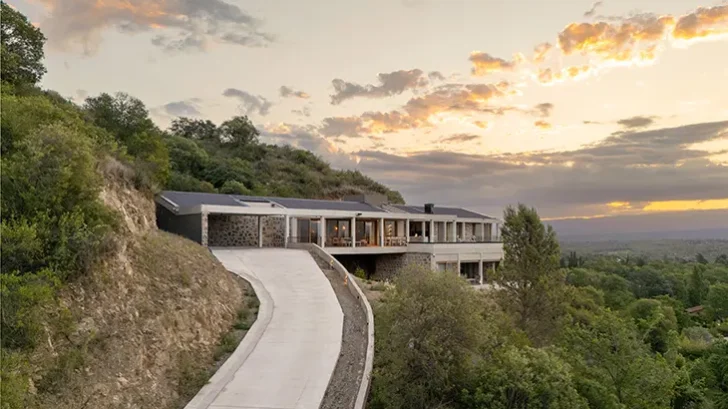 Karlen + Clemente position Summit House within the steep terrain of Villa General Belgrano, allowing the project to grow directly from the hillside rather than impose itself onto it. The architects define the house through a sequence of horizontal volumes that step along the slope, aligning with the natural topography. This decision reduces the visual impact of the structure while preserving the continuity of the landscape. The horizon remains present throughout the project, guiding orientation and framing views across the mountainous setting.
