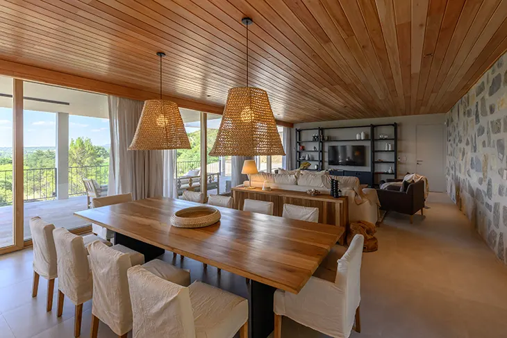 The internal layout prioritizes movement and connection. Social areas unfold as an open sequence that links the living room, dining space, and kitchen without interruption. These spaces extend directly into galleries and terraces, creating a fluid relationship between inside and outside. The architects use these extensions to support different modes of living, from open daytime use to more sheltered evening conditions.