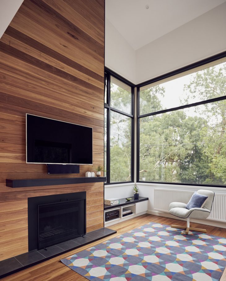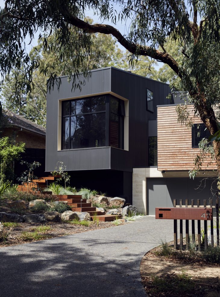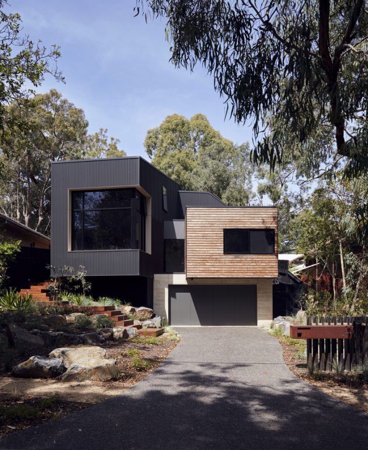This family home is nestled amongst the gums, cantilevering dramatically over the sloped site so it feels more like a treehouse than a regular home.With views from the site cascading down the hill towards Gardiners Creek Reserve in Melbourne’s Blackburn, this modular home crafted by ArchiBlox harmoniously embraces the natural context of the surrounds whilst maximising the sustainable orientation of the site. Separated into two wings to maximise the views, both forms cantilever dramatically over their lower edges sitting above the natural ground level.
