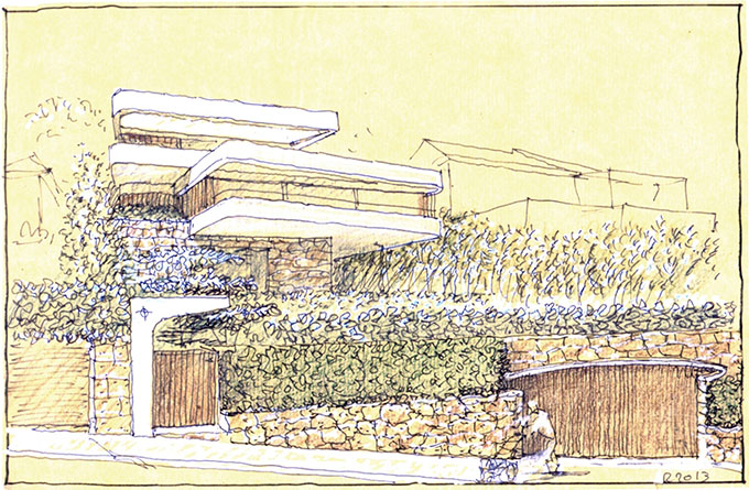 The Architect understood that the books were not only a reference to a home he had previously designed named The Six Degrees of Separation, but also to the ledges and shelves of Sydney-Hawkesbury sandstone outcrops that surface on the steep escarpments of the northern side of Sydney Harbour, including the block of land owned by the Calligrapher and the Businesswoman.