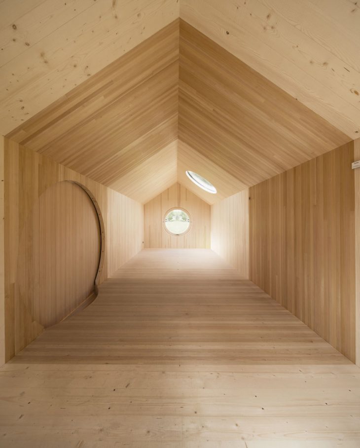The solid wood structures of walls and ceilings are represented proportionally and can be seen close-up at the openings. Doors and windows are round and invite visitors to take a closer look. The protruding wooden dowels in the cut-out openings demonstrate the stiction-based construction. Moreover, the wall, ceiling and floor connections can be seen true to scale.