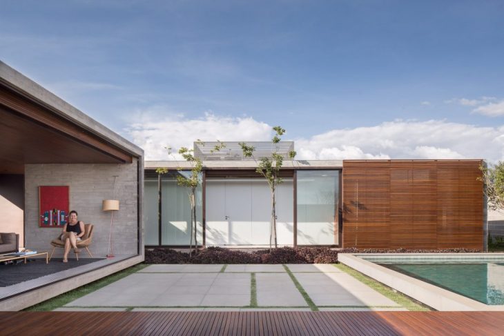 The house is located in a quiet area of Brasilia’s outskirts. The aim was to construct a 300m² single story house to be mostly used during weekends, providing spaces for leisure and socializing.The major challenge was to distribute storehouse in a reduced plot area shaped in a trapezoid form and open to the greenery as much as possible. The house’s footprint comes from the idea of organizing the occupation of the land in two different volumes. The first volume disposes the spaces in a linear way representing the more intimate sector of the house. The second concentrates on the social sector, such as the meeting places. Intentionally, both volumes are articulated creating a square turned to the inside, which provides privacy to the owners.