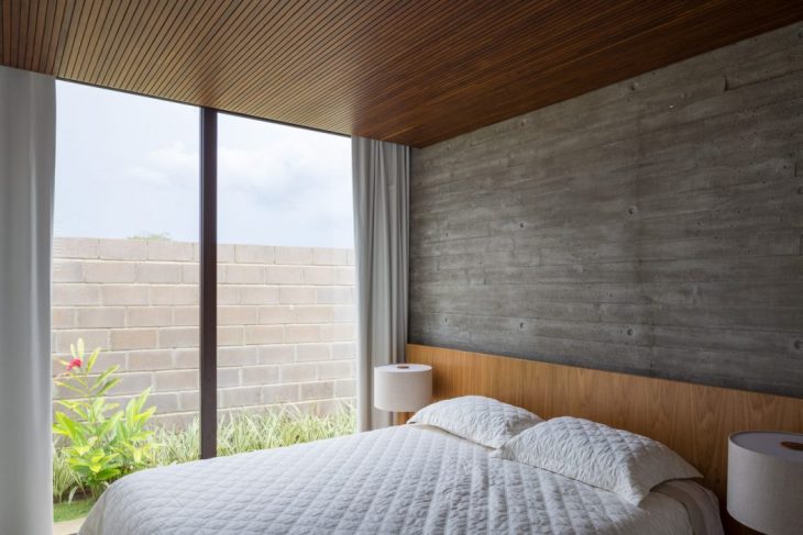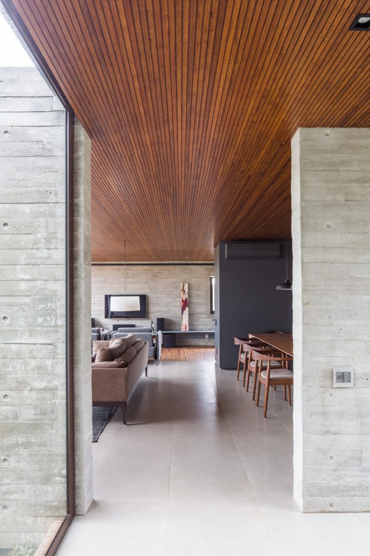 The house is located in a quiet area of Brasilia’s outskirts. The aim was to construct a 300m² single story house to be mostly used during weekends, providing spaces for leisure and socializing.The major challenge was to distribute storehouse in a reduced plot area shaped in a trapezoid form and open to the greenery as much as possible. The house’s footprint comes from the idea of organizing the occupation of the land in two different volumes. The first volume disposes the spaces in a linear way representing the more intimate sector of the house. The second concentrates on the social sector, such as the meeting places. Intentionally, both volumes are articulated creating a square turned to the inside, which provides privacy to the owners.