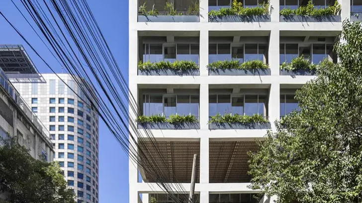 Vegetation forms a central layer of the project rather than an applied gesture. Integrated planters embedded within the concrete structure allow greenery to permeate the building vertically, interrupting the rigor of the grid with organic growth. This system transforms the tower into a form of green infrastructure, where plants gradually occupy and reinterpret the architectural frame. The vegetation softens the structure’s authority while introducing a mutable dimension that changes with time, season, and maintenance.