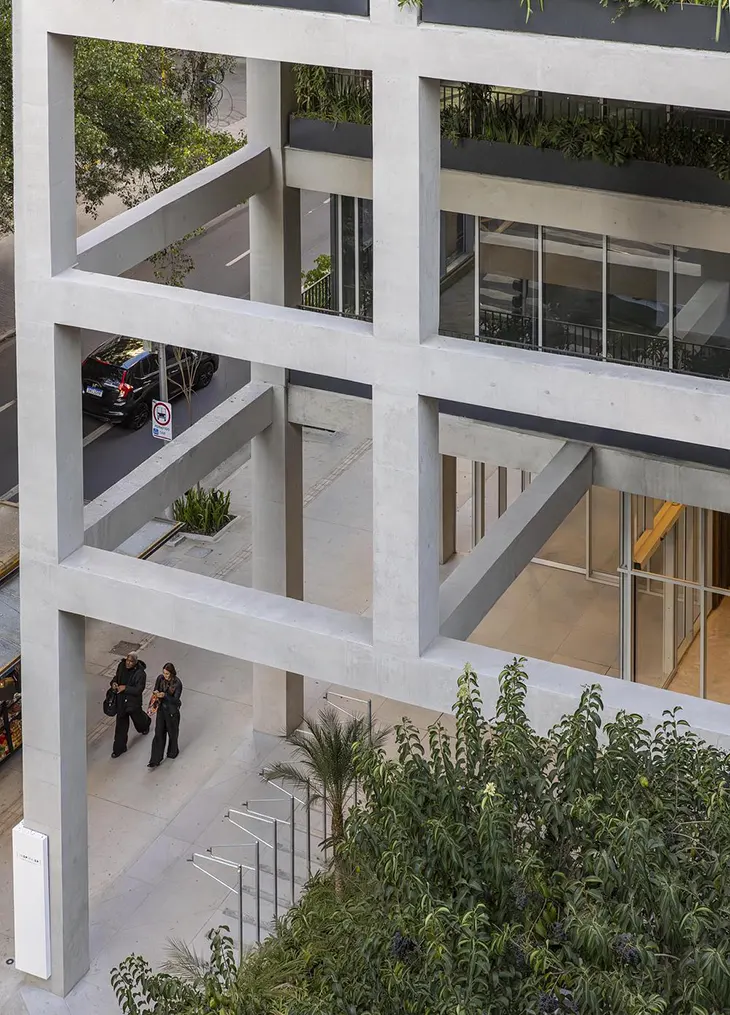 At ground level, the building establishes a deliberate relationship with the city. A public grandstand and planted garden open the base of the tower, blurring the boundary between private development and collective space. This gesture invites public presence and situates the project within the everyday rhythms of Paulista Avenue, reinforcing its role as part of the urban fabric rather than a detached object.
