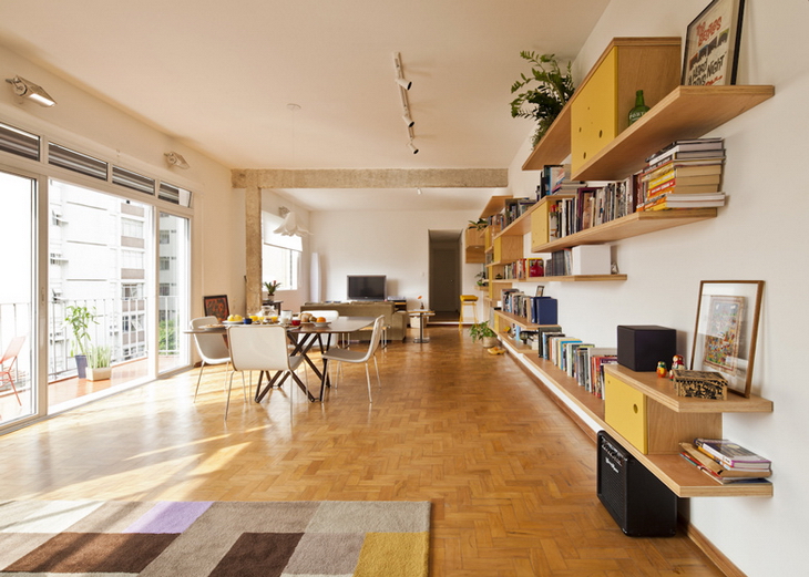 Zoom Urbanismo architects have designed the Apartment Apinagés located in São Paulo, Brazil. Apartment was designed with yellow cupboards and drawers which undoubtedly resemble slices of Swiss cheese. For closer look continue after the jump. More