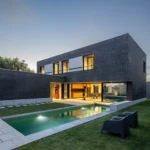 The home’s exterior is constructed from carefully chosen materials that echo its environment. Light wood clads the facades, complemented by gray stone at the foundation, anchoring the structure visually and physically. These elements infuse the home with warmth and rustic character. A sleek black metal roof adds a contemporary contrast, further improving the interaction between tradition and innovation.