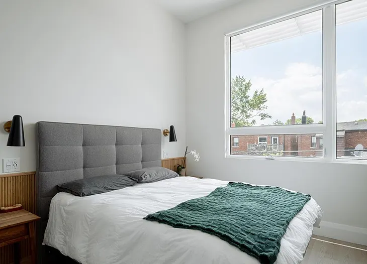 Beyond the interior, the renovation also reshapes the exterior spaces. The rebuilt rear addition introduces a new upper-level bedroom with generous ceiling height and a calm ensuite bath. Outside, a cedar deck and trellis create a welcoming outdoor area for gathering, while a lightweight Douglas fir carport defines the parking area.