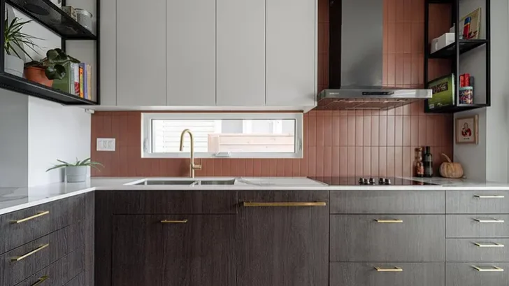 The kitchen itself introduces warm terracotta tones that contrast with the cooler palette found elsewhere in the house. A peninsula topped with a bright porcelain slab extends into the space, while the base facing the living area is wrapped in white oak tambour, adding texture and visual depth. Above the sink, a slim horizontal window provides a linear source of daylight that animates the kitchen throughout the day.