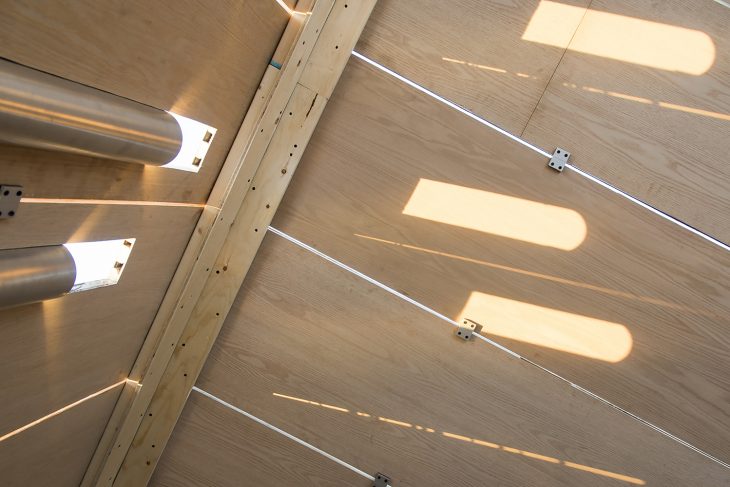 GRIP Metal simplified the process of sandwiching two layers of 1/8 “Oak and one layer of 3/4″ Spruce, eliminating the adhesives typically used for laminate panels. This continuous steel sheet is pressed into the veneer and core lumber in this simple press rolling method. The results are strong and lightweight panels allowing an assembly into a pavilion without need for substructure, the external skin is the structure.