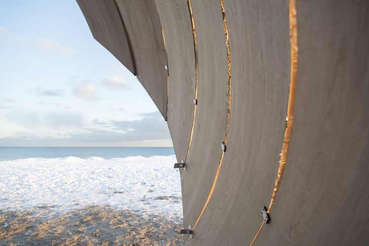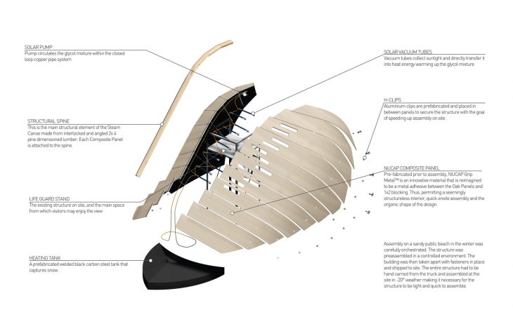 OCAD’s Steam Canoe was inspired by the canoe; The vessel that symbolizes the rich history of the indigenous first nations and early exploration of North America. The shoreline shelter was built to cut through the harsh wind of the cold winter shoreline, reflecting the interior space created by overturned water vessels. Solar hydronic components were installed within the structure, reflecting the underlying theme of freeze-thaw. Evacuated solar tubes heated a capture pan at the rear of the interior, melting snow and generating warm water, creating a fog halo that emerged from within the structure.