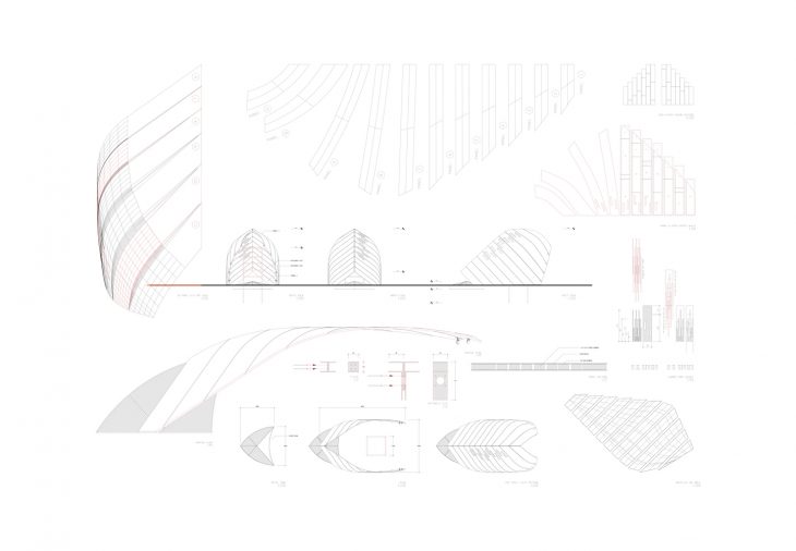 The Steam Canoe structure was achieved with a combination of computer assisted parametric geometry, manual cutting of the computer generated forms and innovative experimental production combining the traditional process of rolling Press Laminated Timber Panels with a new mechanical fastening technology called GRIP Metal, a type of “metal velcro,” applied in the form of continuous thin-gauge sheet metal layers, with grip hooks on both faces of the sheet.