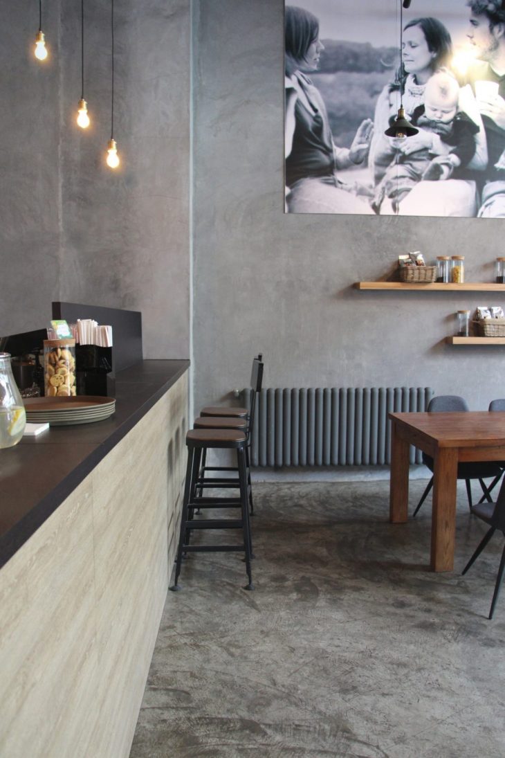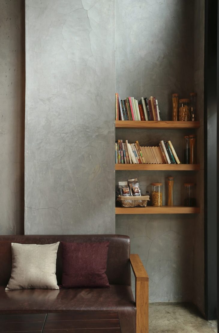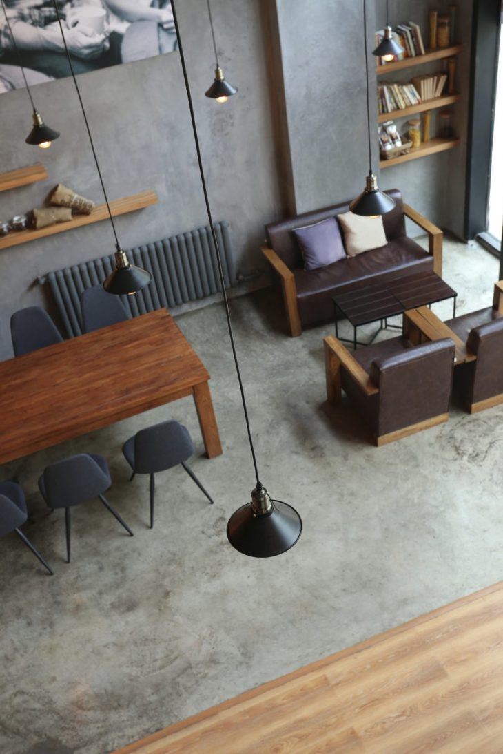 The design language is based on a limited range of materials: black steel forms the handrail of the second floor mezzanine as well as the staircase, and creates a shelf behind the cashier. Concrete walls and flooring provide the main elements in the first floor, while the mezzanine enjoys wooden floors. The furniture is selected to contrast with the steel and concrete, with comfortable fabric chairs and sofas along with warm lighting.
