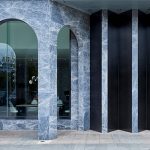 A large pool is designed in front of the architecture and it looks like that the whole building is floating on the water. A 50 meter corridor cuts surface of the pool and connects the entrance of the sales from which the guests can access the interior space slowly. Before accessing the entrance, the guests passes a 16-meter-high entrance of light marble wall. It is so high and its side surface looks like a flexagon from distance. Entering the compacted corridor from the open exterior space, then enter the open interior area, which forms a rhythm of compact and open space.