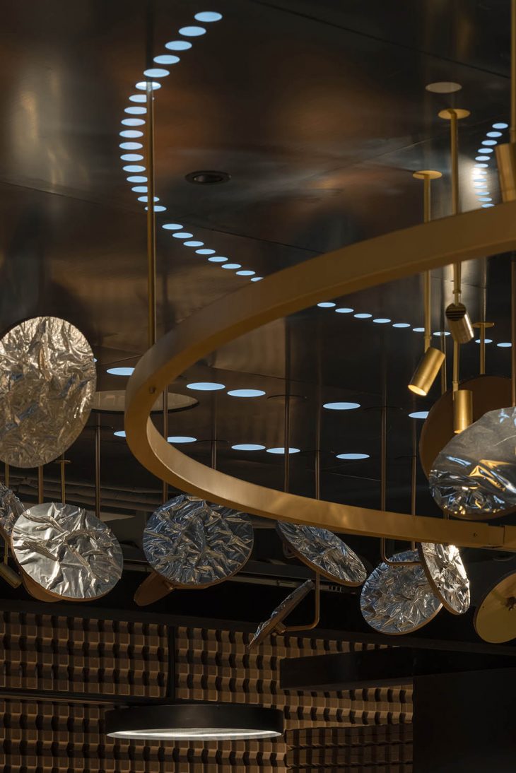 The 81 discs are distributed on the top surface of the ceiling in the central dining area. We hope that from any angle, we can see different appearances. The staggered settings of heights allude to the imagination of the cloudy and sunny moon. And based design logic of points, lines, and surfaces using RGB light color programmable and constantly changing characteristics, combined with the disc to form the image of the universe astrolabe.