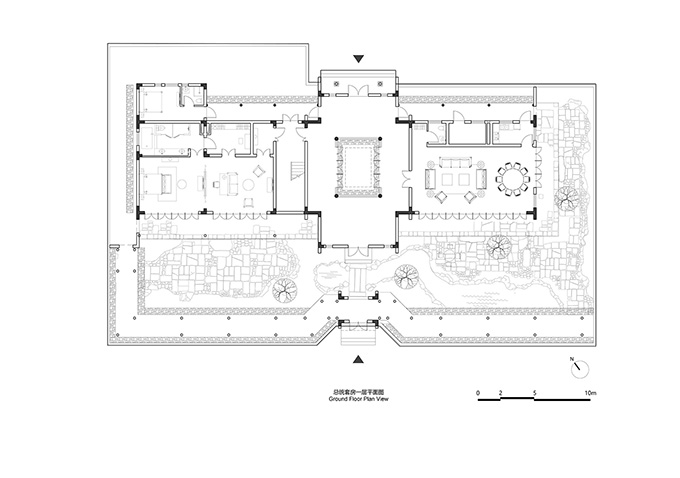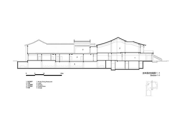 The main functions of the hotel community are composed by courtyards located on both sides of the central axis of the main entrance. There are some tall arbors at the eastern side of the courtyard in the base. The west side courtyard is built on the top of a roof so as to create a private atmosphere of two rooms with a simple atmosphere.