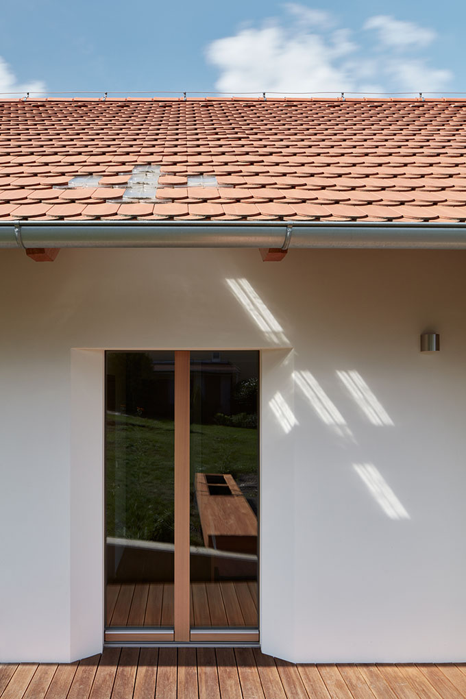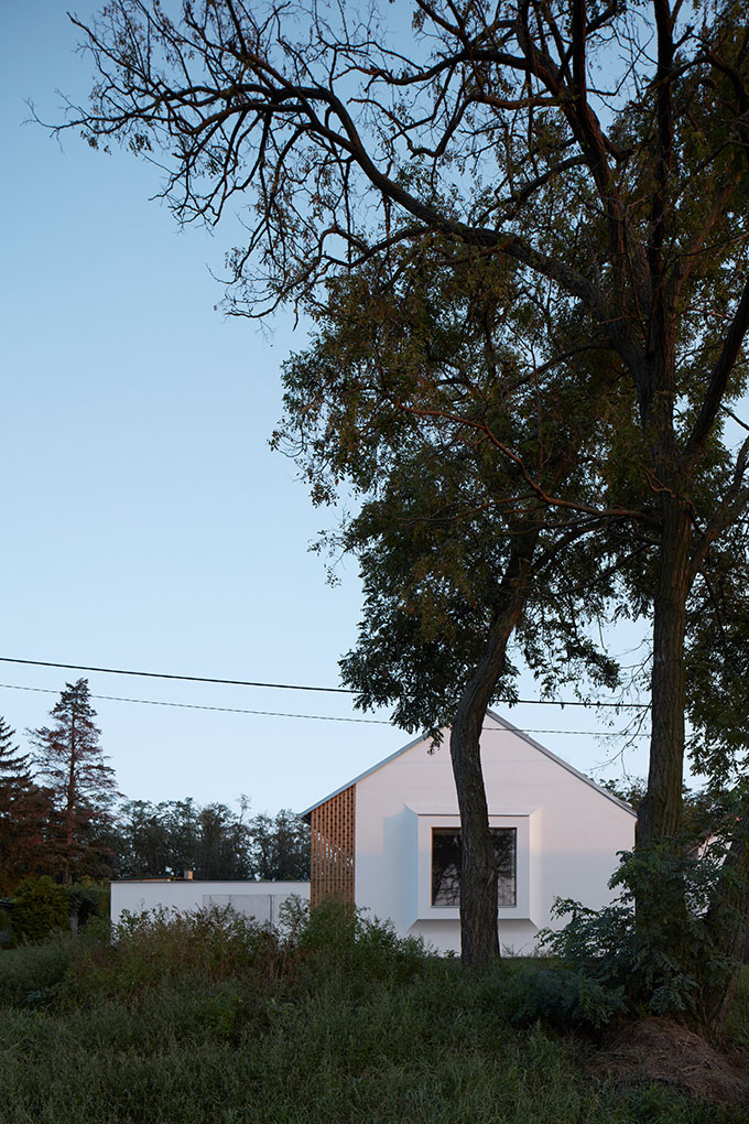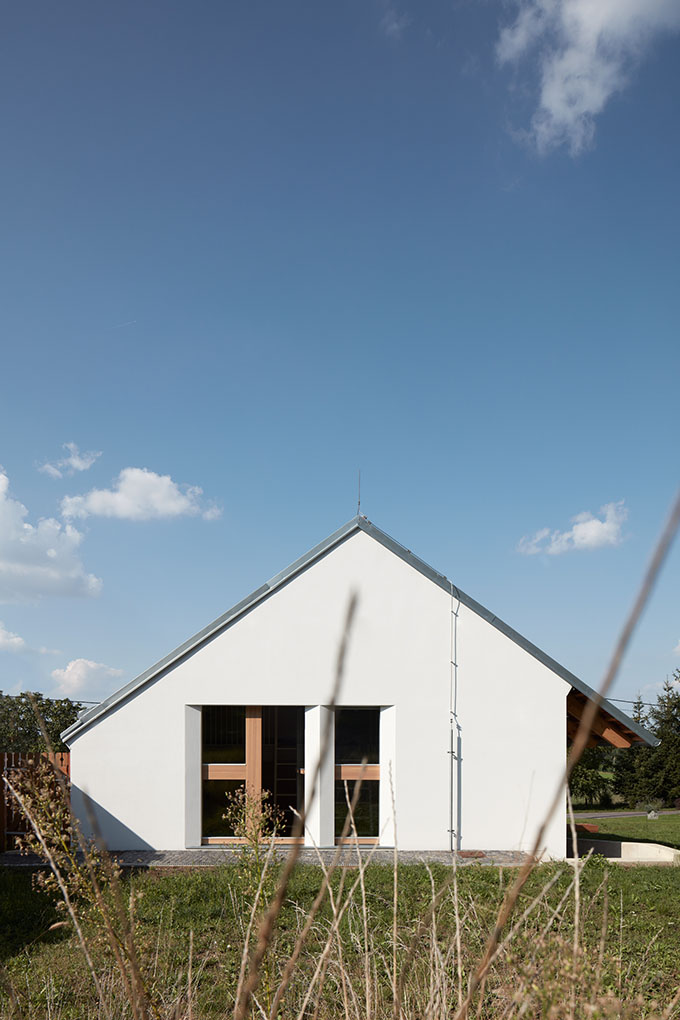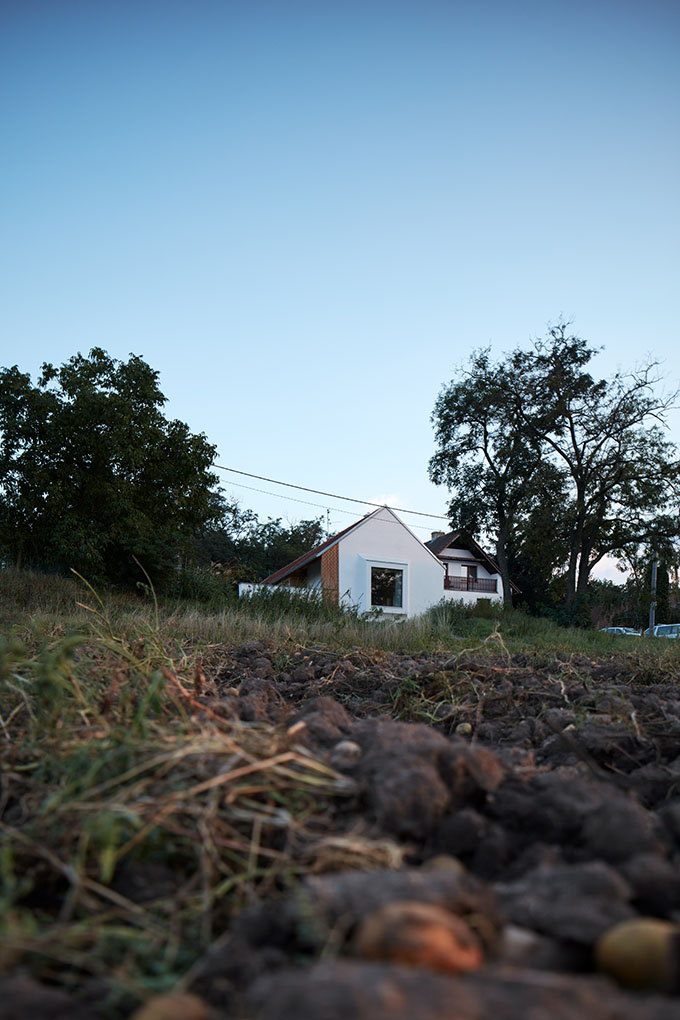 We began by exploring the concept of a contemporary Moravian village. Today, the definition of a rural house in Czechia seems to be ambiguous. Within a village, nobody pays attention to the historical and settlement context anymore. We think that Czech and Moravian village experiences one of the largest urban planning crises in history. Our aim was to show that a country house should not act as an urban villa placed carelessly in the middle of the estate, a phenomenon common for most of today’s projects. Rather than isolating the estate from its surroundings, it needs to open up and find its way back to the street. Instead of turning away from the street, we wanted to highlight its existence. Unlike a garage, a prominent window was to articulate the connection between the interior and the street. Nonetheless, maintaining privacy for the inhabitants formed an important consideration – a private courtyard located behind a wall is also a well-known feature of local country houses.