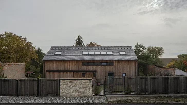 In the village of Vraný, Mimosa Architects designed the Family House in Mature Garden, a residence that negotiates its steep, green terrain with sensitivity. Surrounded by a wild garden descending toward the Vraný stream, the project takes advantage of the natural slope, orienting its interiors toward both the private greenery and the surrounding landscape. Rather than imposing a rigid order on the site, the architects allowed the terrain and garden to guide the spatial arrangement, resulting in a home deeply tied to its setting.