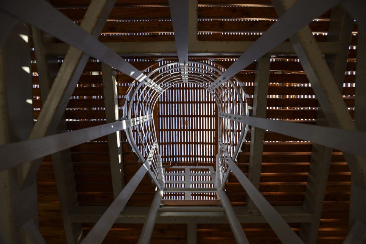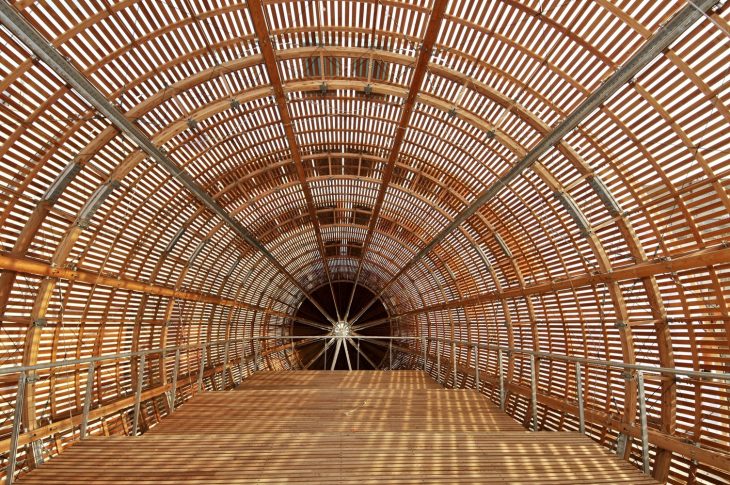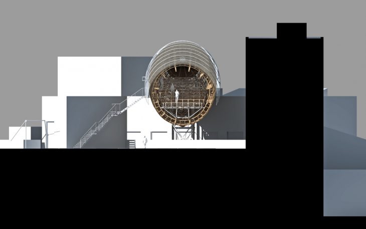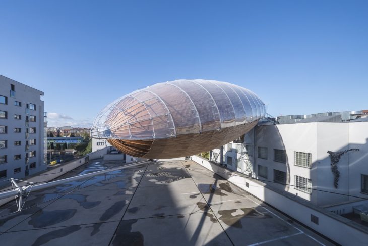 A unique monumental architectural intervention, inspired by the elegant shapes of early 20th century airships, is growing on the rooftop of one of the largest contemporary art spaces in the heart of Europe. The 42 meter-long steel and wood structure will become a new permanent space for literature at the DOX Centre for Contemporary Art in Prague, Czech Republic. Discover more after the jump.