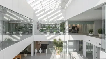 The space celebrates its industrial heritage through exposed brick walls and reinforced concrete beam ceilings, which retain the character of Kabelovna. Large French windows provide generous views of the garden, creating a connection between the indoors and the outdoor surroundings. The integration of natural light and greenery helps soften the industrial feel.