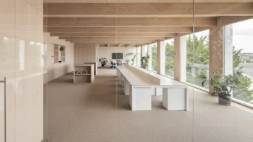 A neon logo graces the exposed brick wall, injecting a playful yet modern touch that aligns with the studio’s identity. Functional custom lighting, crafted by Vojtěch Kálecký, provides targeted illumination over workstations, while a standout light fixture by Bomma adds a sense of sophistication to the meeting room. The epoxy resin flooring serves as a practical, durable surface, complementing the mix of preserved and newly introduced raw materials.