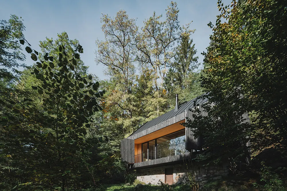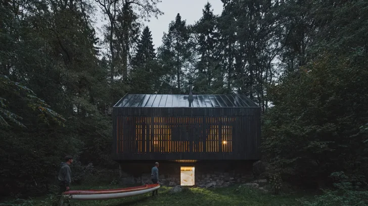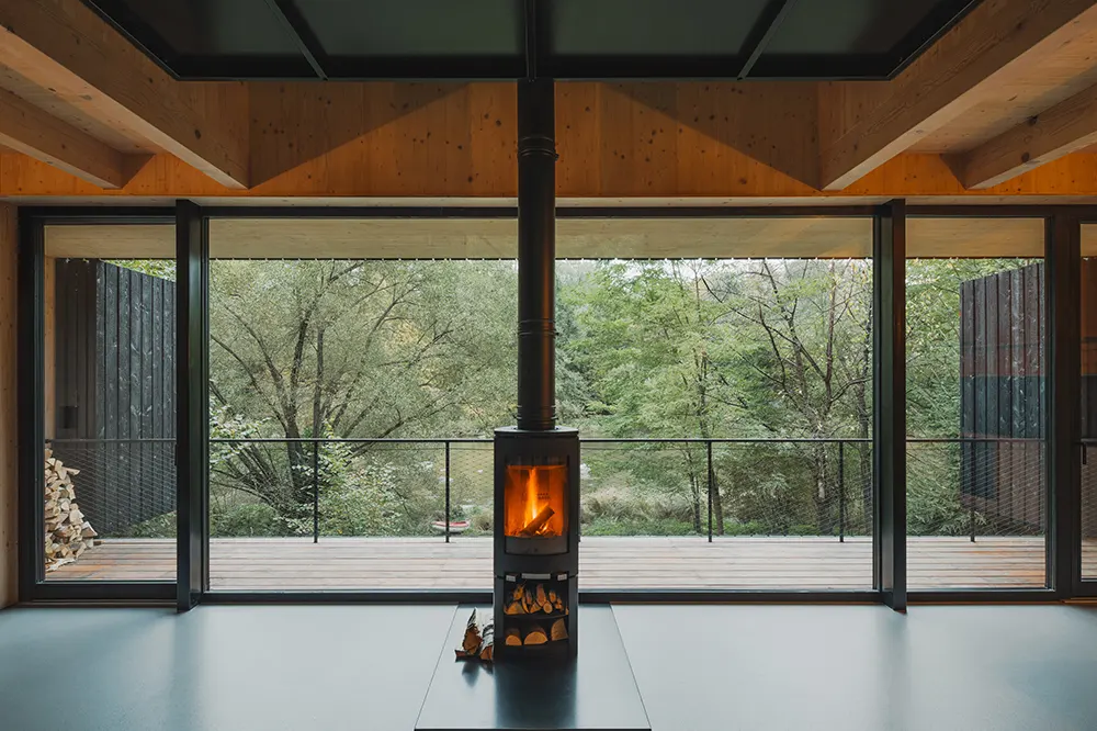 The site carries a clear memory. A previous cabin once stood here, before fire reduced it to a stone plinth. Mimosa Architects approach the project by accepting that condition rather than replacing it. The remaining base becomes the starting point for the new structure, anchoring it physically above the river while setting a measured distance from the landscape. The cabin sits between two forces, water in front and rock behind, and the design holds that tension without trying to resolve it.