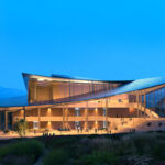 The café features a partially transparent roof that accommodates a tree, creating a unique visual element. The roof also supports a polished steel ellipse, which becomes visible at sunset thanks to a lighting installation. The neon word ‘Budoucnost’ (Future) on the weather-resistant steel façade invites contemplation about society’s future, further enhancing the park’s reflective and artistic atmosphere.