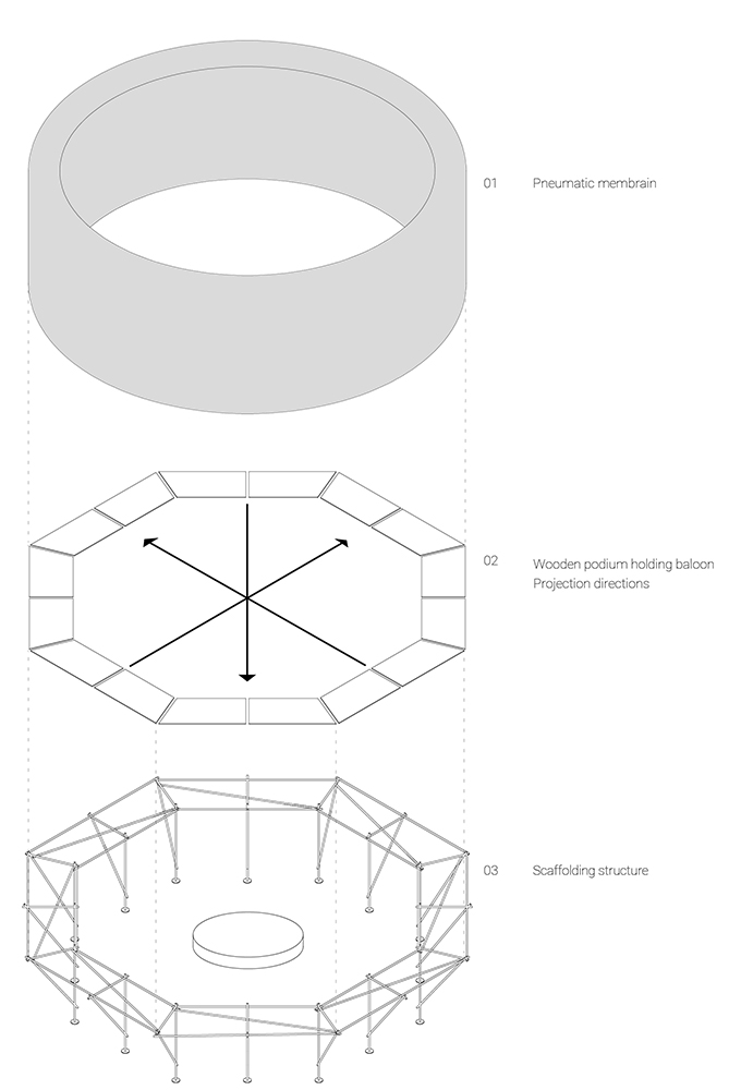 The design combines either rented or reusable materials that are simple, economical, robust and quick to build with. The primary structure is a simple scaffolding system designed together with the partner company Peri. The inflatable part is custom designed and hand-made by local craftsmen by partner company Reklama Kubí?ek, and was designed with holes for projectors, making it a perfect 360 degrees screen for outdoor events and fully washable and re-usable.