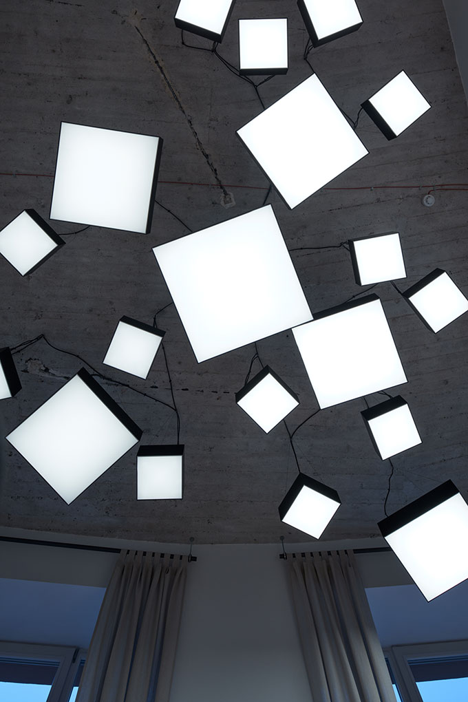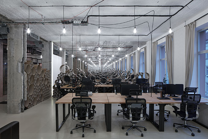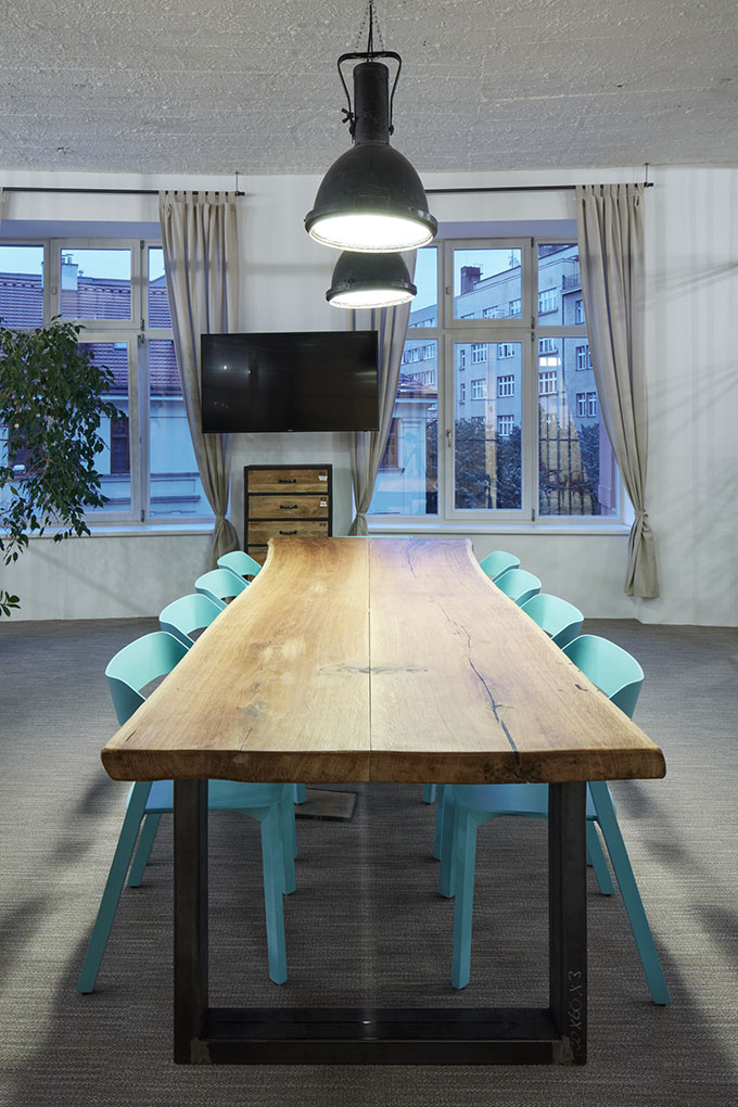 Each of the individual elements has a story to tell and provides an added value. The division of the open space is created by paper tubes that also fulfil the function of storage space, creating the unique identity of the project. The free-standing partitions were installed during the weekend before the Monday opening by employees themselves, with our assistance and coordination. The chosen colour of the polyurethane layer is an ivory dye – the colour which gave Winternitz Villa the title of the “beige princess”. This colour also surfaced in the roller painting used, which in itself was a challenge for the painter to brush up his old skills. Much of the interior furnishing is the result of a demanding search in antique shops, combined with refurbished armchairs, as well as the inclusion of brand new elements from an established Czech manufacturer. The biggest of the tables – a 750 kg item made of oak offcuts – is an example of sophistication blended with exceptional craftsmanship, perfectly emphasising the dignity of the main meeting room. The lighting utilised is largely the output of one of the divisions of the company itself.