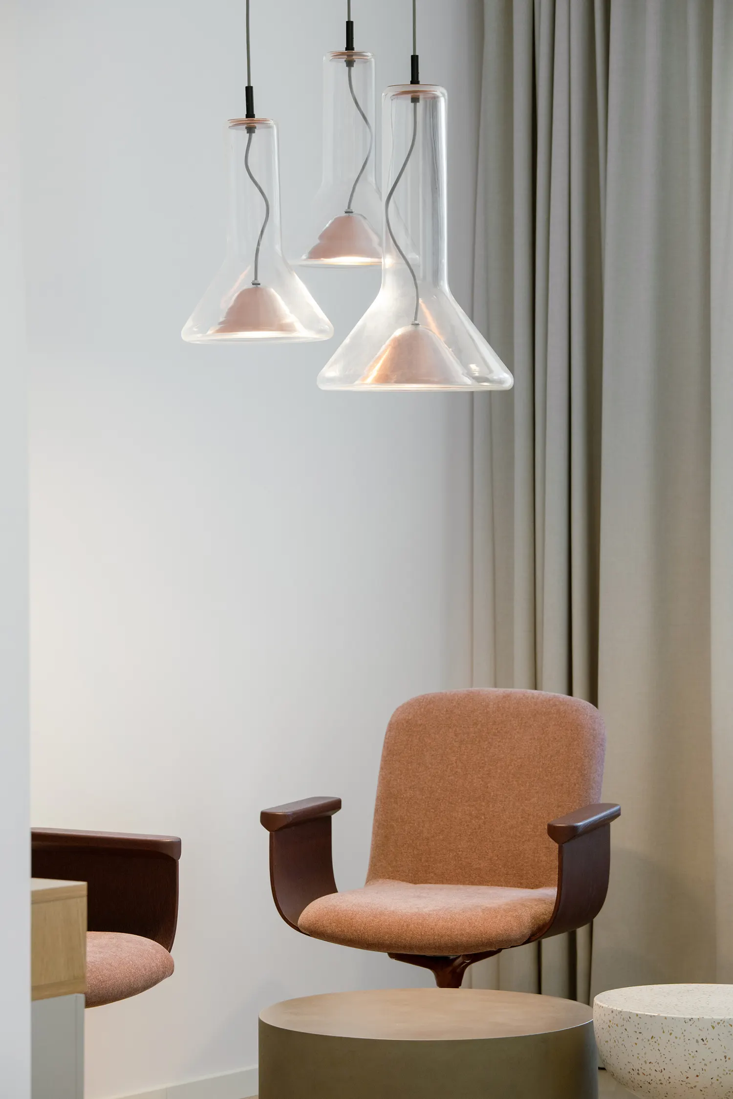 Attention to detail is evident throughout the project, from the selection of materials to the integration of furniture and lighting. The use of high-quality suppliers and brands, such as Arte Brotto, Kave Home, Brokis, and Laufen, further elevates the environment. Each element contributes to a unified whole, supporting a work culture that values both collaboration and individual focus.