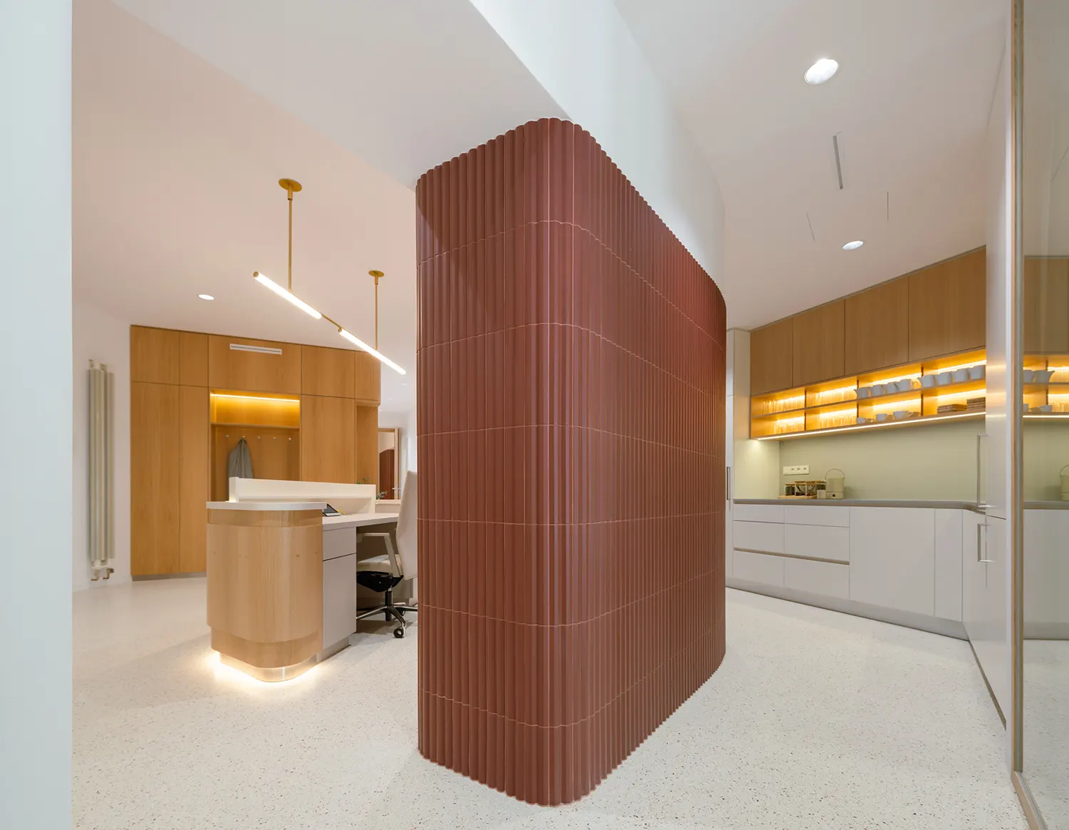 A defining feature of the renovation is its thoughtful material palette. The design team reimagined formerly dark corridors as softly curved passages clad in red ceramic tiles. These tiles have become a signature element, providing a bold yet harmonious visual identity. In the restrooms, the ceramic surface appears in lighter tones, softening the palette and establishing a quiet continuity across the floor. The ceramics are balanced by natural oak flooring, custom furniture, and window frames, which bring warmth and a grounded feel to the interior. Custom walnut meeting tables in the shared areas introduce a tactile contrast, reflecting a focus on durability and craftsmanship.