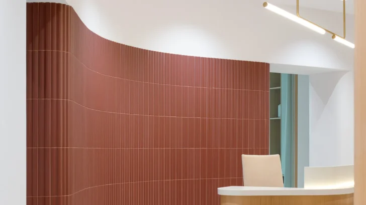 A defining feature of the renovation is its thoughtful material palette. The design team reimagined formerly dark corridors as softly curved passages clad in red ceramic tiles. These tiles have become a signature element, providing a bold yet harmonious visual identity. In the restrooms, the ceramic surface appears in lighter tones, softening the palette and establishing a quiet continuity across the floor. The ceramics are balanced by natural oak flooring, custom furniture, and window frames, which bring warmth and a grounded feel to the interior. Custom walnut meeting tables in the shared areas introduce a tactile contrast, reflecting a focus on durability and craftsmanship.