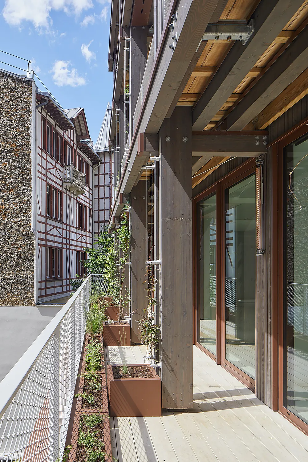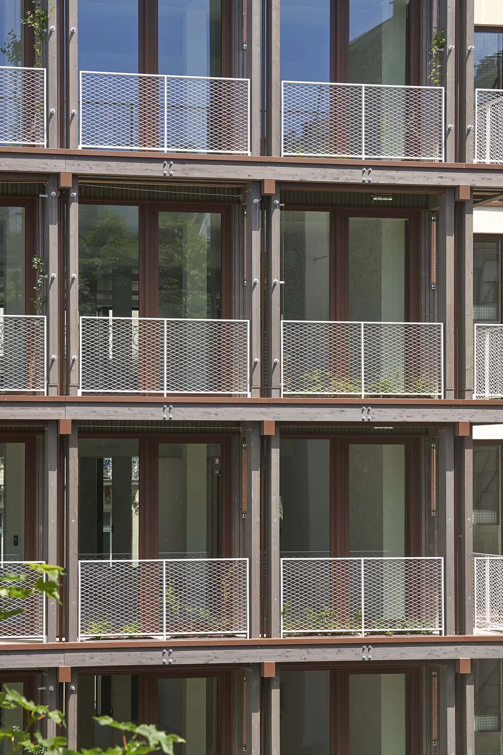 The courtyard façade shifts the architectural language. Here, the project adopts a lightweight wooden structure, drawing directly from Japanese construction principles. Post-and-beam elements define the extension, creating a more open and permeable relationship with the garden. This side of the building operates with greater flexibility, allowing terraces and planted elements to extend outward.