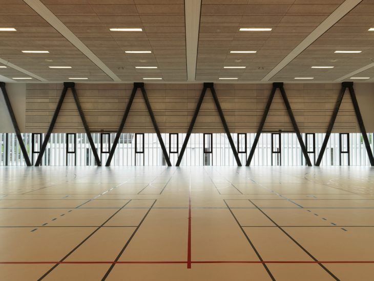 The imbrications of the four programmes located at the base and which function in a totally independent way is included in a façade system, vertical rhythm alternating aluminium and glass, which unifies the whole structure inside a bright transparent envelope. The project is open on all sides and the activities inside are visible, a way to bring movement and life and liven up the public space.