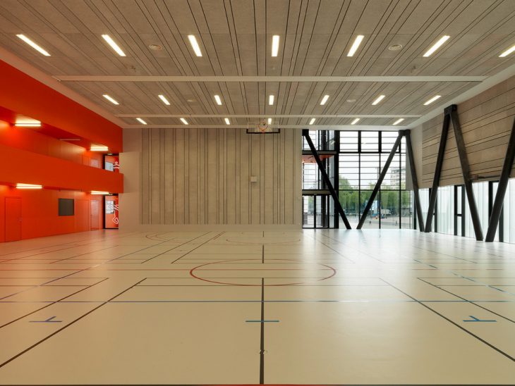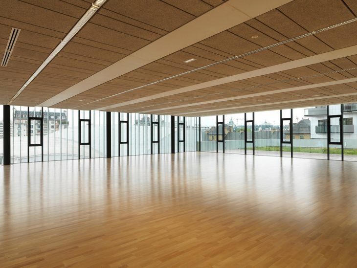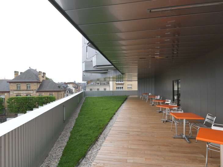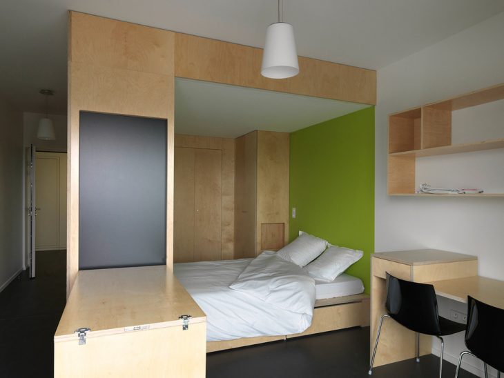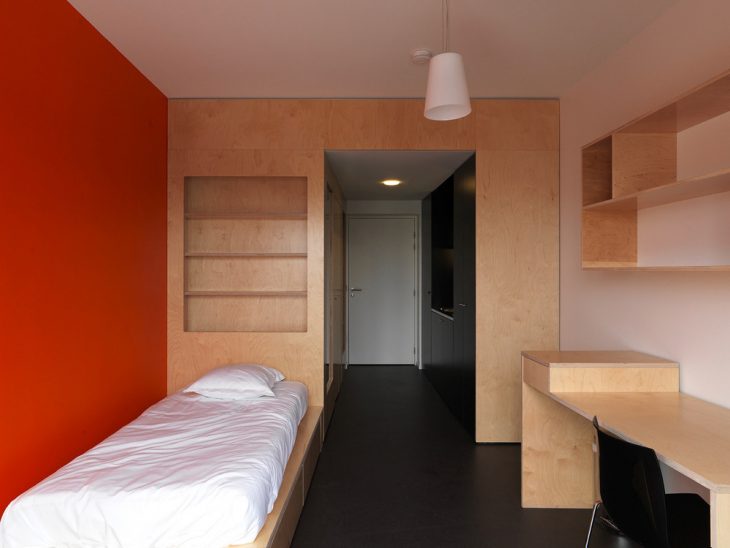 On the boulevard, the vertical building houses the residence for foreign academics. Its design creates a contrast with the lower part and it is partially separated from it by way of a void at the 4th level. Each room has its own large bay window with a French window opening onto the balcony. The rooms’ furniture, made of multiply beech wood, is made to measure. It includes the kitchen, the bed, the desk and numerous integrated storage spaces.