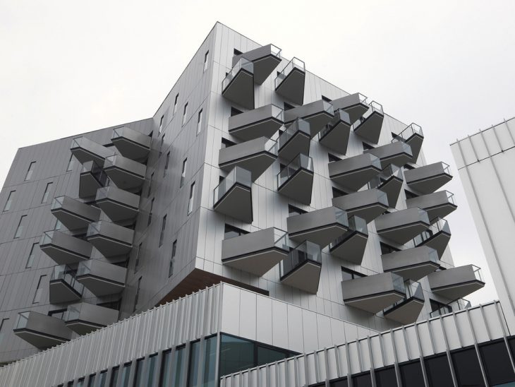The façades’ graphic system stems from the climatic logic. To the east and to the west, the protruding polished-aluminium vertical needles offers efficient protection from the sun. The whole generates an abstract composition with subtle texture variations. The image changes according to the view angle: almost invisible when facing them, the needles create large paintings when seen sideways.
