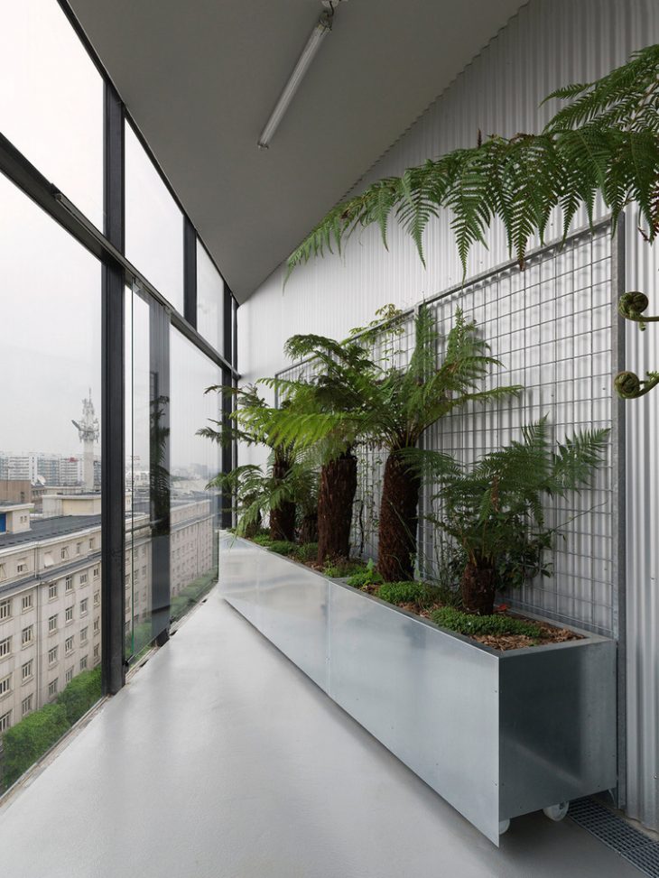 The north façade on the boulevard de la Liberté is created by the winter gardens which offer both thermal and noise insulation. The very light and simple-glazing façade alternates fixed and opening panels. Vines and tree ferns are planted in the back and the whole thus form a large green image open towards the city.