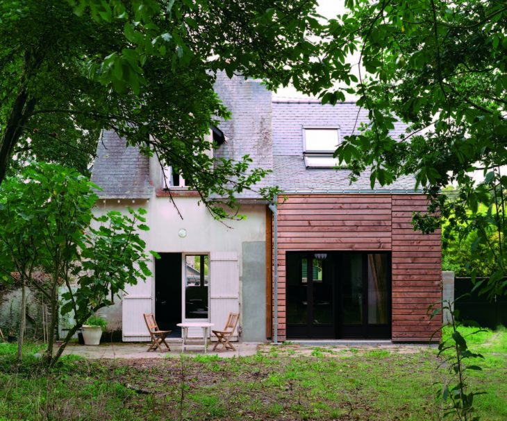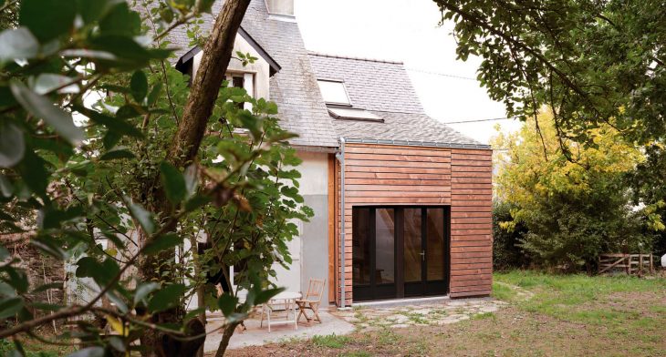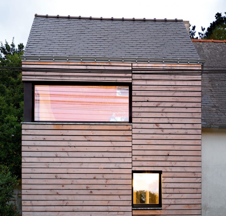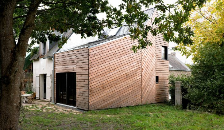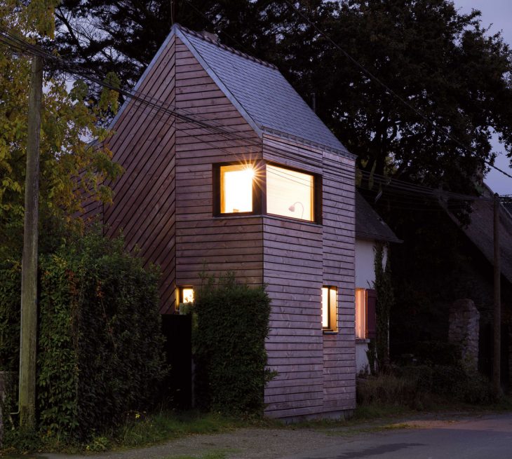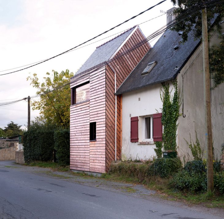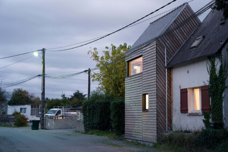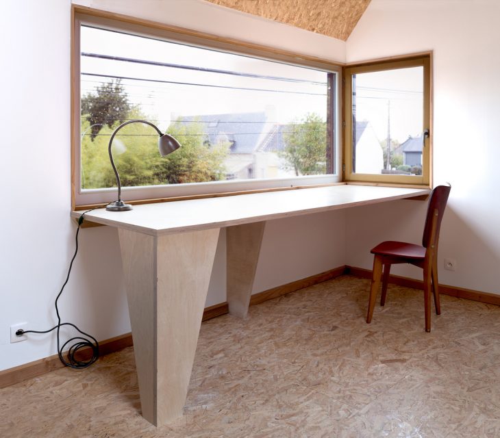 Located in a tiny village facing salt marshes on the French Atlantic coast, this wooden house extension is a modest holiday home and a writer’s retreat. The client idea for this project was born several years ago when saving a few old, massive oak beams from the demolition of a neighboring farm. The idea appealed to us but it was all we knew when we first visited the site. A building plot has its own history. This plot was the site of an ancient traditionally built house of which only a single stone and cob wall survived, incorporated into a newer, unusual development. Standing on site for the first time, we found ourselves looking at a rather odd, amusing, tiny house. It seemed to be a narrow slice cut out from a volume midway between an oversized train model house and a common local dwelling. Moreover, given the building materials used, this surreal appearance was only mimicking traditional architecture while coming straight out from the seventies. This was the starting point of the project. So how could we create a dialogue with this intriguing presence, especially so resonant with the habits of long daily usage? We rapidly set a goal: use the extension to create a view over the neighbour’s fence across the street, towards the sea in the distance and to place the owner writing desk in this pivotal spot. While doing so, we also wanted to open up the building, creating volume and bringing in precious sunlight and making its practical functioning as simple and easy as possible and everyday living a real pleasure.
