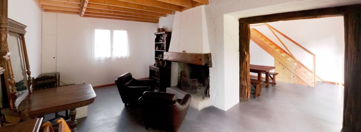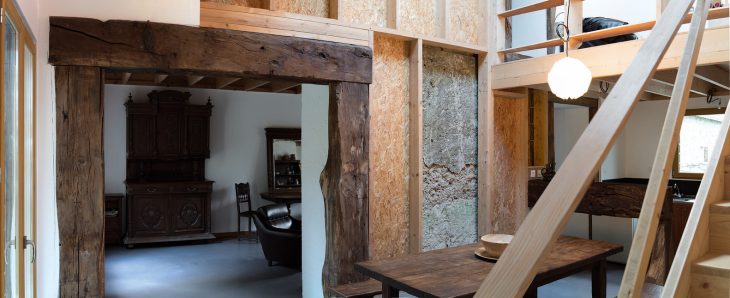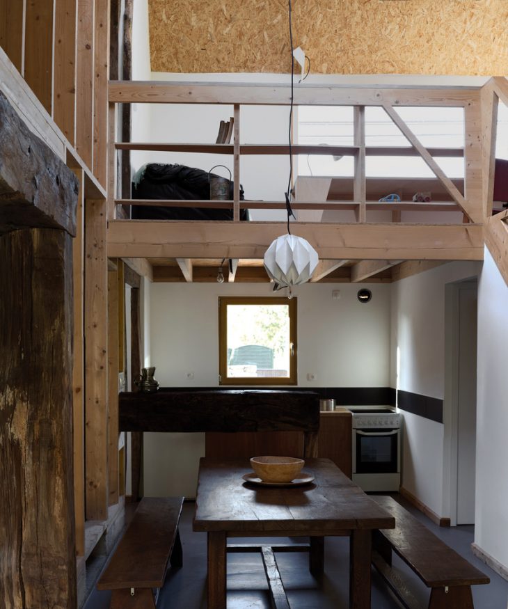 This meant a complete interior remodeling of the existing house, particularly in relation to the new addition. Three different openings were put into the wall linking the two, reorganizing movement within the house. On the ground floor, the ancient fireplace was turned into a central spatial element, anchoring the domestic space. A circular path starts around the fireplace, passing towards the new extension, climbing a flight of stairs and through the mezzanine that takes in the landscape. Furthermore, on the first floor, the path returns to the ancient part of the house and reaches the two bedrooms, now the only private area, separated from the otherwise open volume of the house. The old oak beams at the origin of the project found an appropriate symbolic place by framing all three openings between the old and the new. The old oak beams at the origin of the project found an appropriate symbolic place by framing all three openings between the old and the new. Technology was kept to a minimum in the hope of a reliable, long lasting and largely autonomous lifespan. The materials used are natural and locally produced: wood wool and cork for the insulation, Douglas fir wood with no chemical treatment either for the structure or for the cladding, zinc and slates.