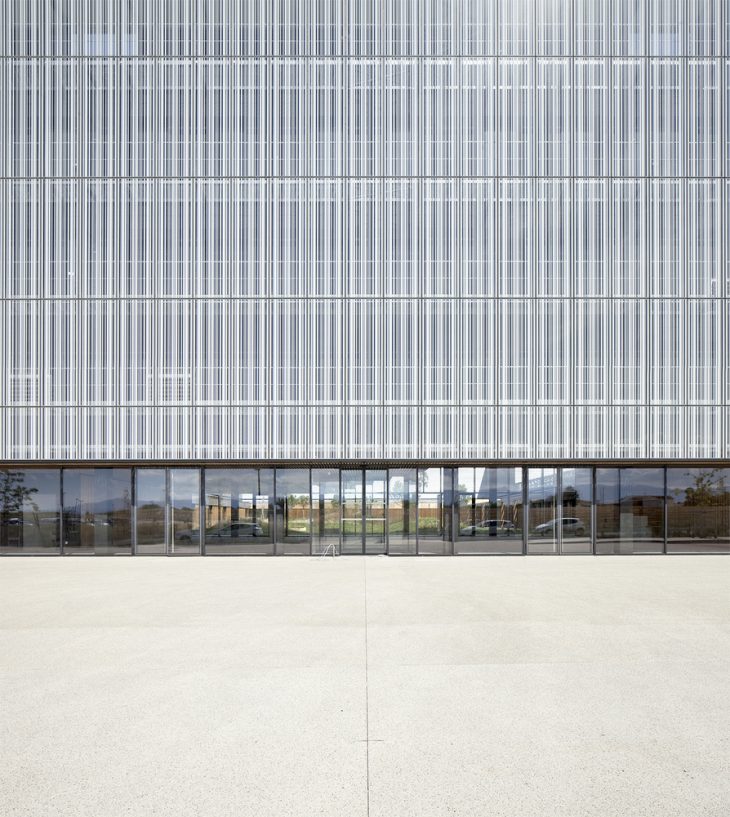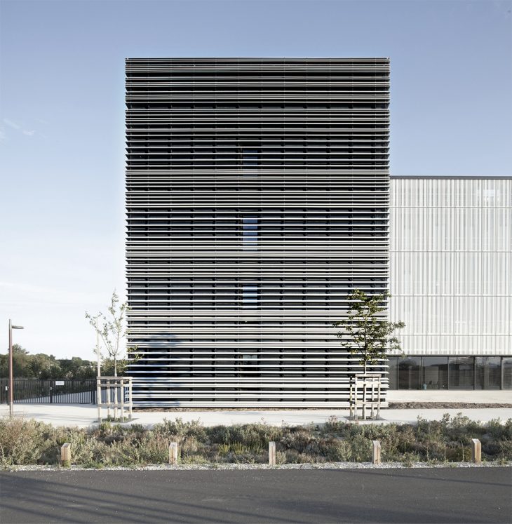 The composition of the façade on the scale of a building follows a sedimentation process similar to that of the Vercors massif. Each building applies the same system that links an external insulation ensuring high thermal performances, a coloured metal cladding of which the tones echo those found in the surrounding landscape and a system of louvre horizontal panels that protects one from solar radiation while integrating all the ventilation systems and that offers great flexibility in its implementation. The irregular distribution of the horizontal blades answers to the specific requirements and constraints of the premises (offices, laboratories, technical spaces etc.) and offers for the Ecotox centre a visual interpretation that is unique and rooted in its surrounding.