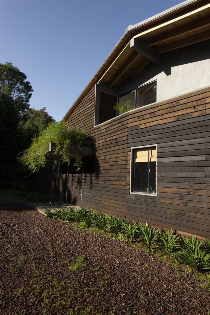 In the exterior, wood is used as a skin, mixing its aesthetics to resemble different houses depending on the point of view. Due to the inclination of the terrain, from the interior the terraces loose themselves towards the trees, under this terraces plants grow to visually hold the house on a floating position. The roof with a skylight above the stairs to the master bedroom, has a gabled shaped to unite the house into one volume.