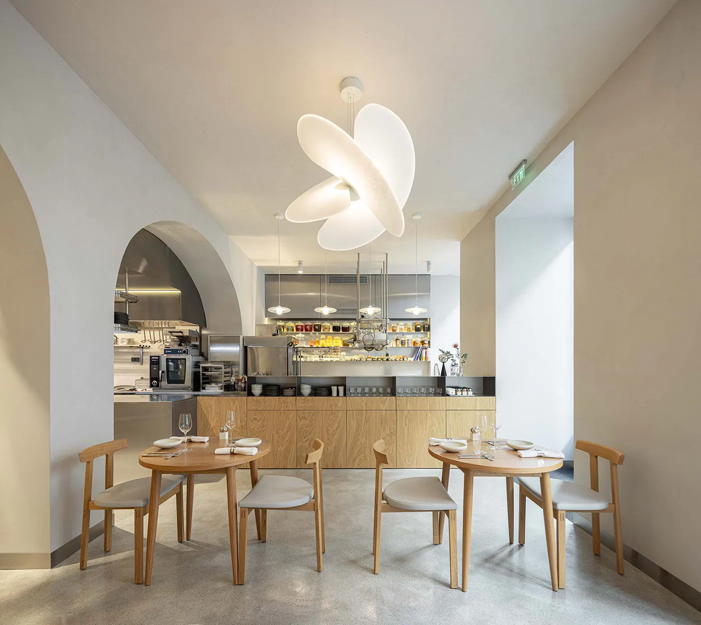 Lighting is a defining element: large fan-shaped fixtures provide diffuse illumination, while Ginkgo Biloba leaf forms crafted in burel offer ornamental detail and acoustic comfort. The result is an environment that feels both welcoming and sophisticated, with technical complexity concealed beneath an aura of simplicity.