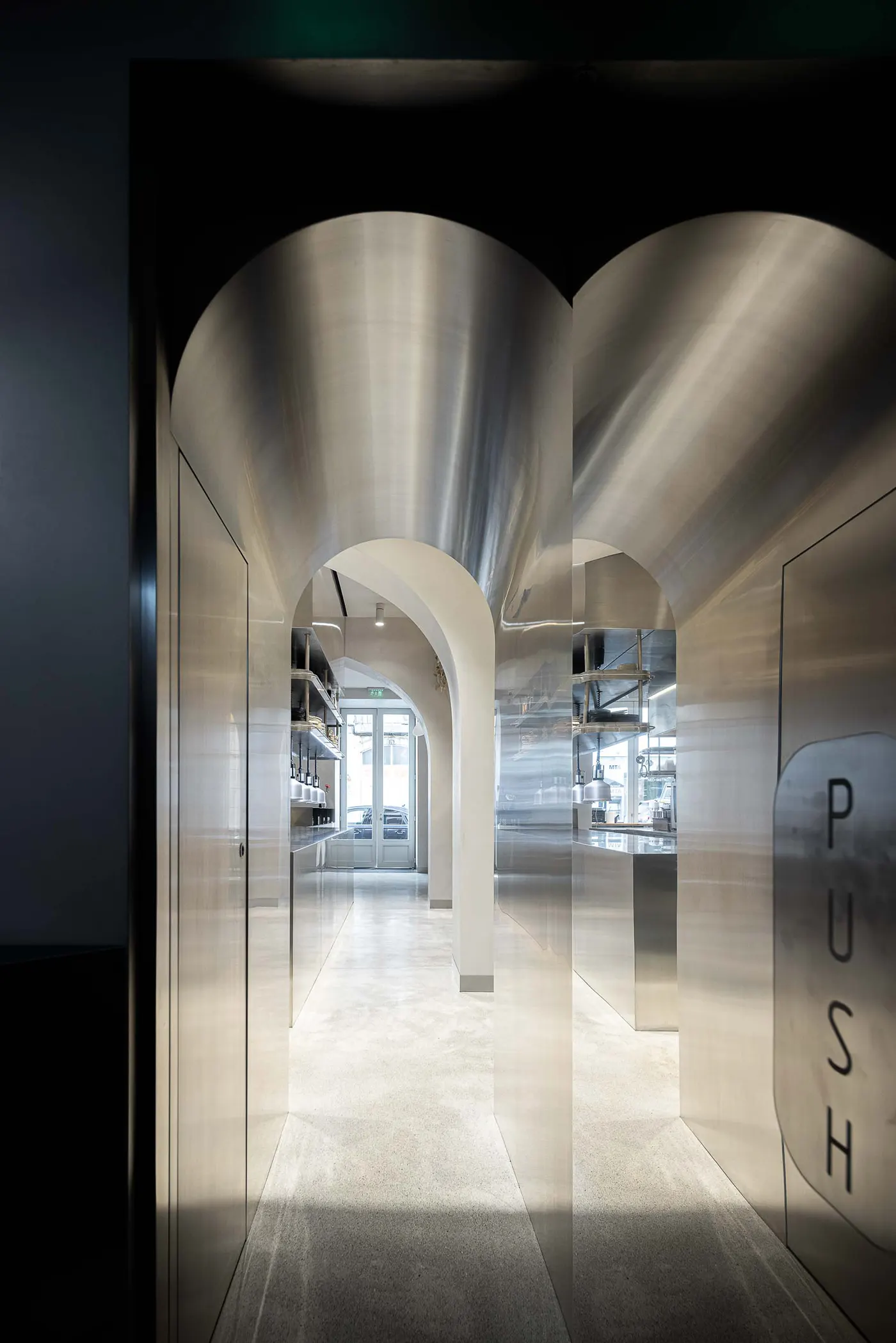 The spatial configuration remains largely intact, with new interventions carefully integrated to avoid overshadowing the historic framework. The continuous terrazzo flooring by Cunha Leal reinforces the space’s neutrality, while stainless steel elements by Plan B and bespoke oak, walnut, and leather furnishings introduce tactile contrast. The material selection, including wall coverings by Richimi and acoustic ceilings by Stier, balances durability with understated luxury.