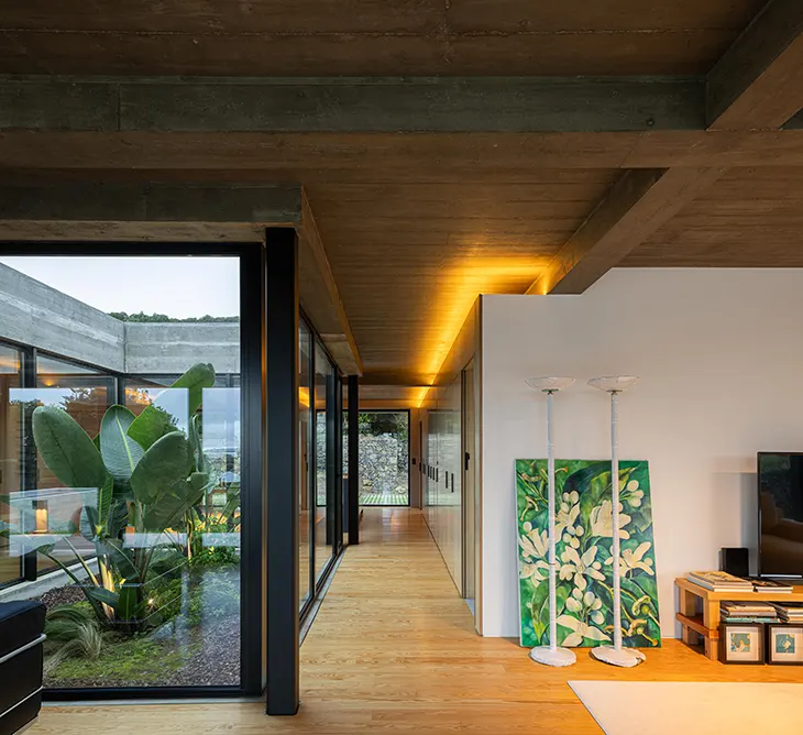 Material selection grounds the architecture in sensory experience. Concrete defines the structural framework and canopy, while wood-lined interiors soften the atmosphere and introduce warmth. From any point in the house, the exterior remains visible, whether through expansive glazing toward the Atlantic or across the courtyard garden. The visual field remains continuous, dissolving hard boundaries between inside and outside.