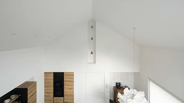 Upon entry, a double-height ceiling reveals itself immediately. The pentagonal geometry enables vertical expansion that introduces a sense of openness. This generous space transitions into more intimate zones scaled to embrace daily routines. The interior balances spatial variation with material warmth. Antique furniture pieces, handcrafted elements by the architect, and natural decorative components create layered domestic character.