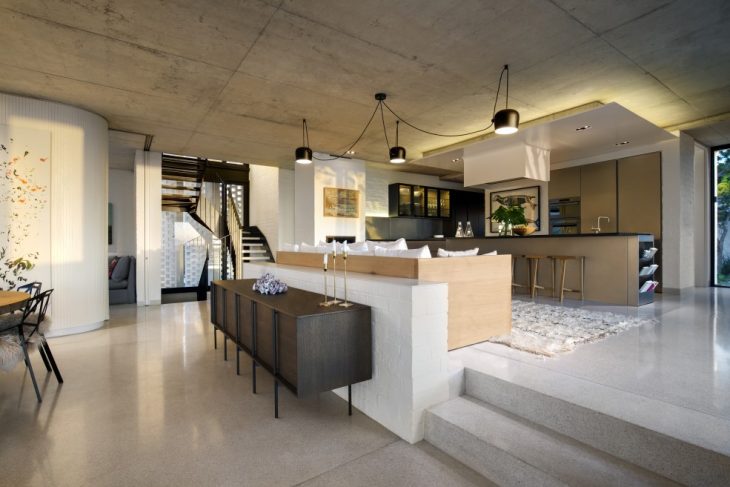 The individual open-plan rooms flow seamlessly, forming one extended living zone and central space. The welcoming kitchen and lounge area is at the centre, with a sofa in the kitchen large enough to seat the entire family. The living rooms have a direct relationship and the flow between these spaces add a unique dynamic to the house. A sense of mystery is created through the various spaces glimpsing each other.