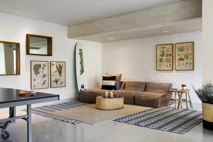 Behind the scenes, the home is technologically enhanced with the latest audio lighting and systems that can be automated for time of day – with the beauty being in the understatement and absence of seeing it. Finishes to the home include the use of terrazzo floors. Beach house style is integrated with modern finishes, in the likes of the marble-layered panels that extend up the bathroom walls.