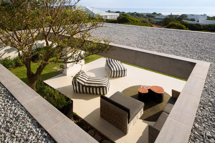 Built at good elevation with lots of access to the surrounding fynbos, the natural choice for landscaping was to incorporates as much indigenous vegetation as possible – surrounding the house and in the internal courtyard. The addition of three iconic South African trees – Milkwood, Coral trees and Waterberry’s – make this an iconic, true-to-style South African family holiday home.
