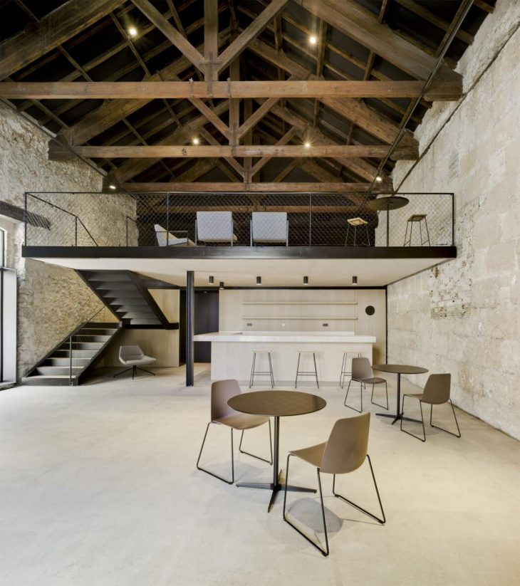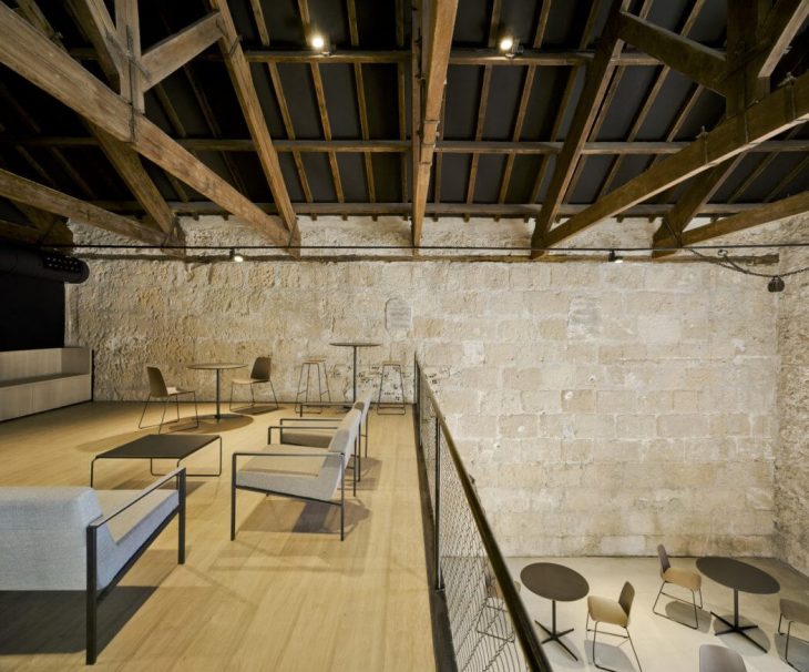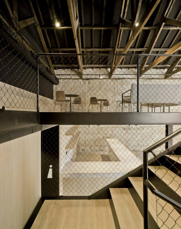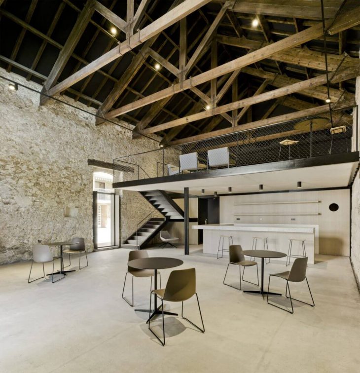 An interior redistribution of the existing surface area is suggested, as well as a small expansion which takes advantage of the spatial dimensions in order to, by creating a double-height, offer the possibility of savoring the building from unknown points of view, placed on different levels and allowing to put value on highly important and singular elements such as the original wooden structure that forms the roof.